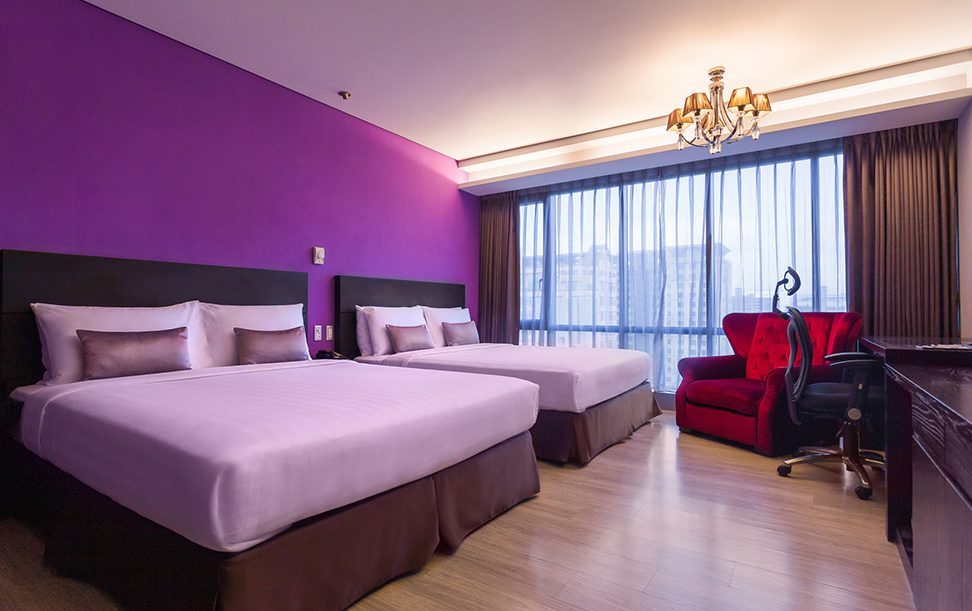 Guest rooms are inspired by Baroque element with a classic yet modern and trendy design, alive with glasses and diffused lighting surrounding the room. Each room is redefined with crystal chandelier hanging above the rooms’ ceiling. Every room contains ergonomic office chair, specialized “Lazzy Mattress” for additional bed comfort, and various pillow selection are also available if needed. Complimentary bath set, VOD paid-TV channels, and selected mini bar items can be found in the executive rooms.
